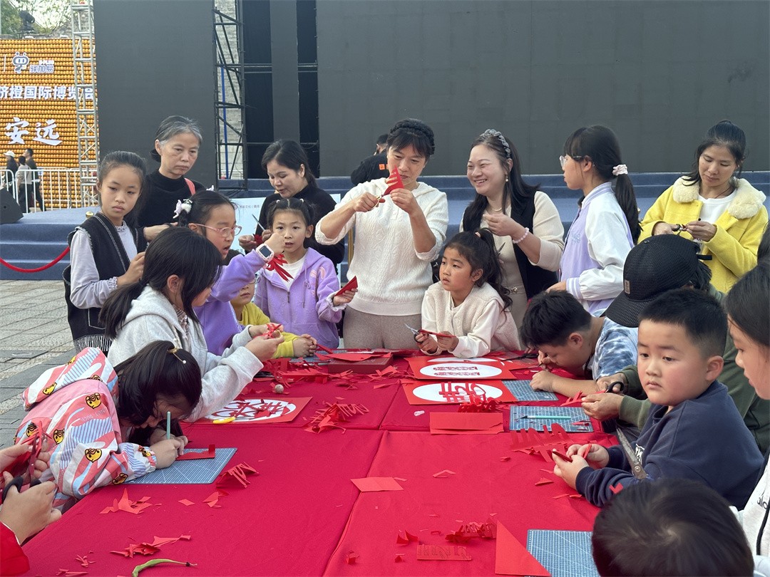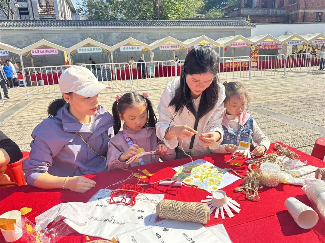 体验区始终人气高涨。从客家草本发酵合香香包的制作,到麻绳草帽的编织,再到赣南客家剪纸与漆扇的创作,每个项目前都聚满了兴致勃勃的市民。