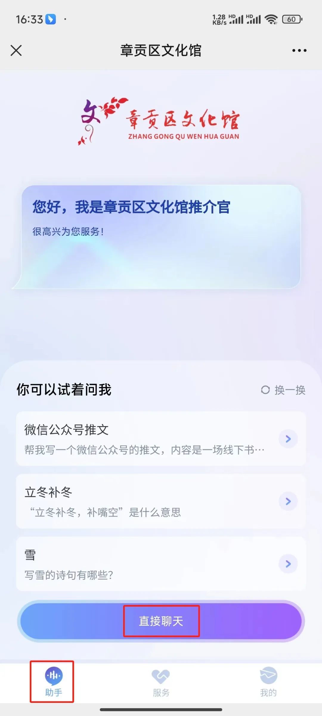 开启文化推荐官,可通过首页“助手”栏目“直接聊天”,支持语音和文字两种输入方式。活选择“服务”栏目中的各项板块,根据提示输入问题提示词。