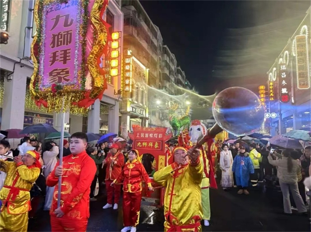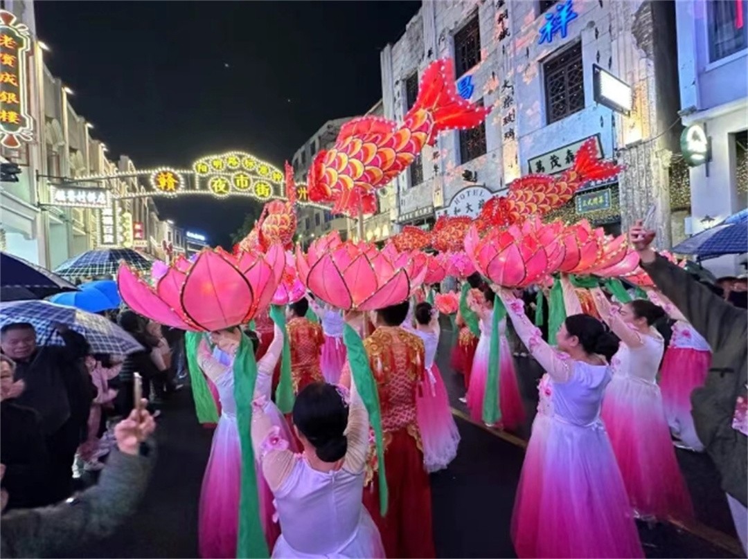 巡游队伍中,章贡民俗踩街,南康鲤鱼灯、定南瑞狮、石城灯彩等轮番亮相。流动的非遗展示与满城灯火交相辉映,沿途市民游客举着手机记录这一年一度的盛景。