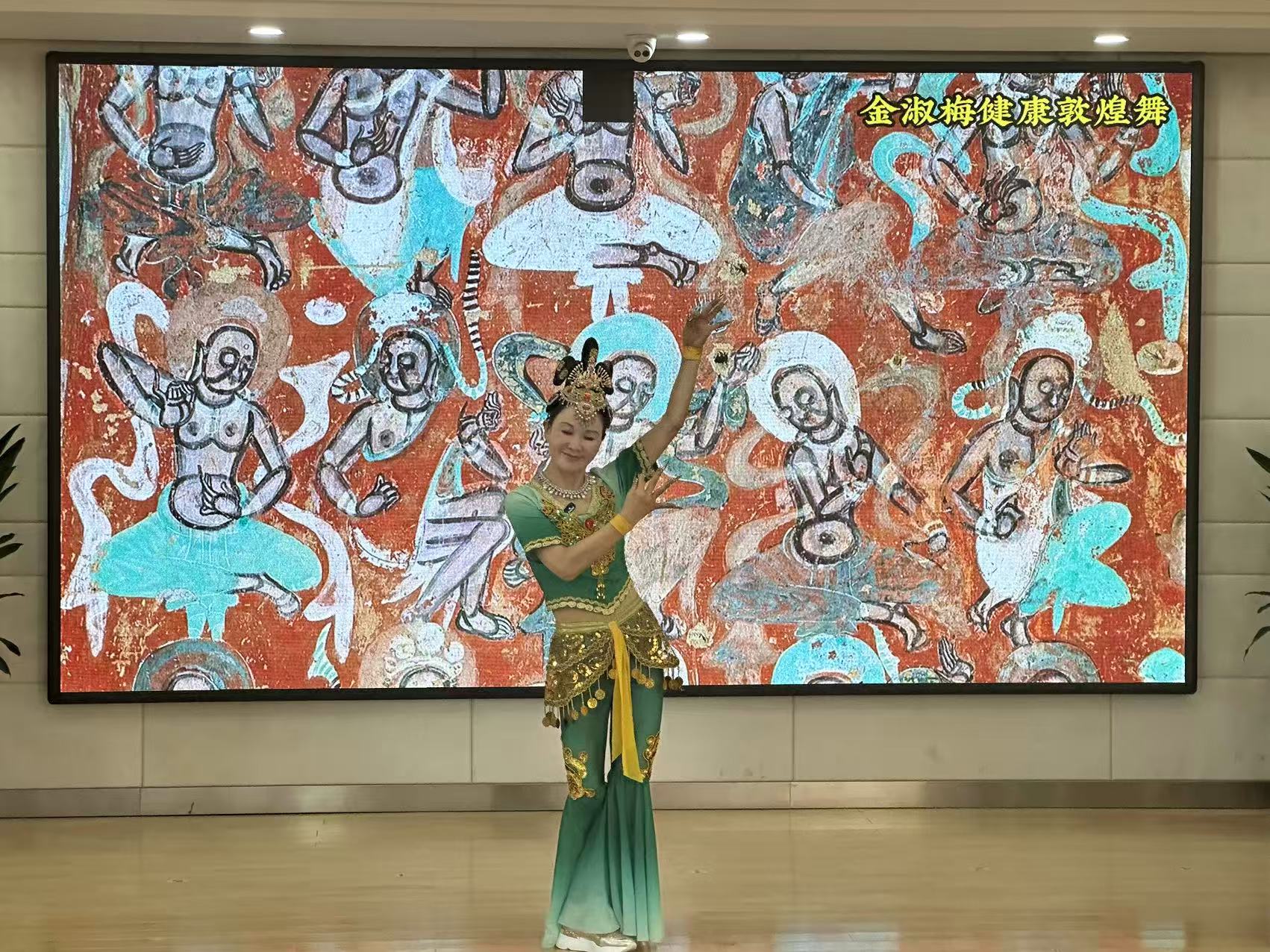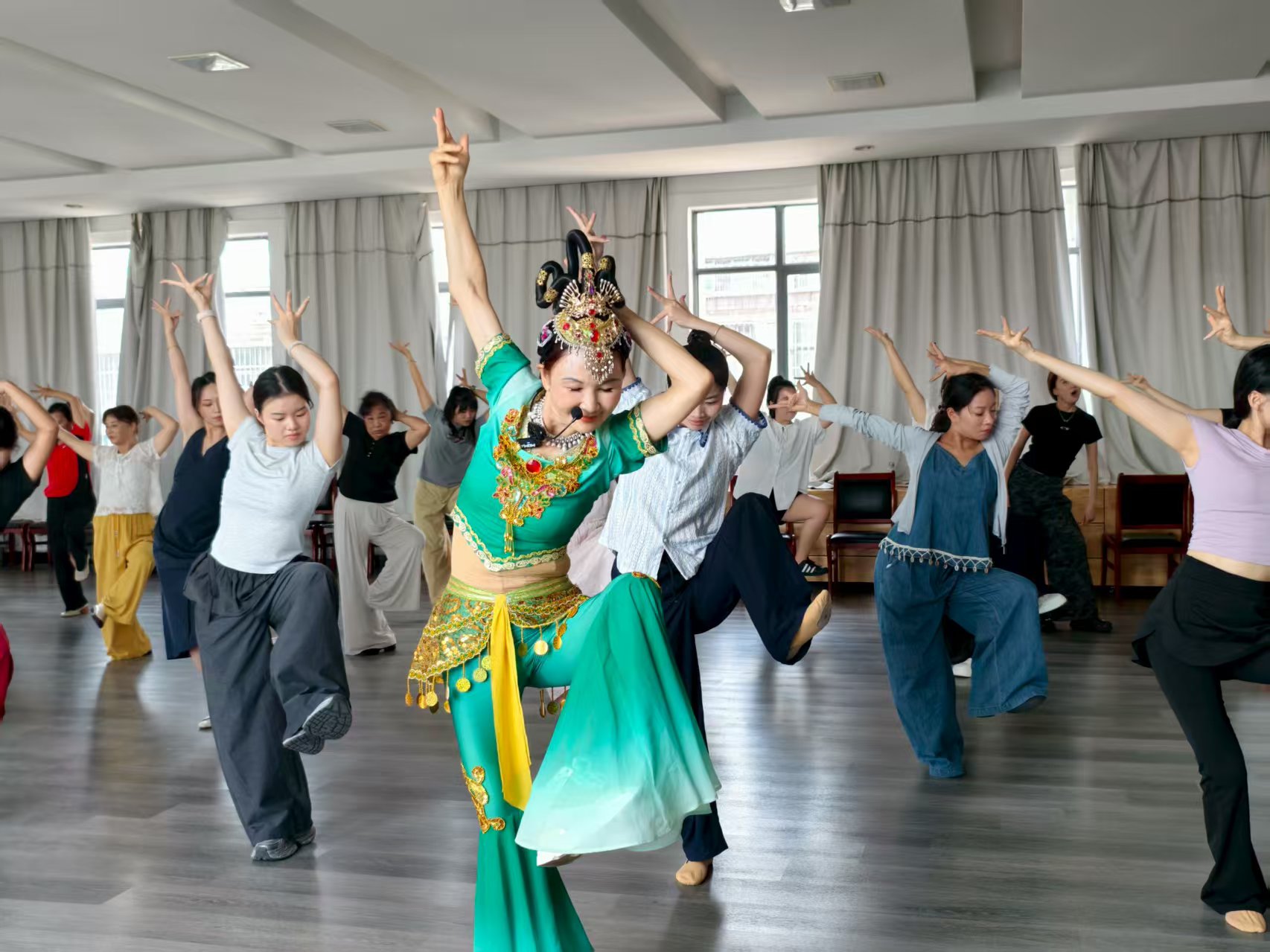 在实践环节中,金老师细致讲解了健康敦煌舞的基础动作与组合练习教学,体验了如何将敦煌舞的优美舞姿与健康养生理念相结合。通过现场示范、分组练习与互动交流,大家不仅掌握了基本技巧,更深刻理解了敦煌舞所承载的文化内涵与美育价值。