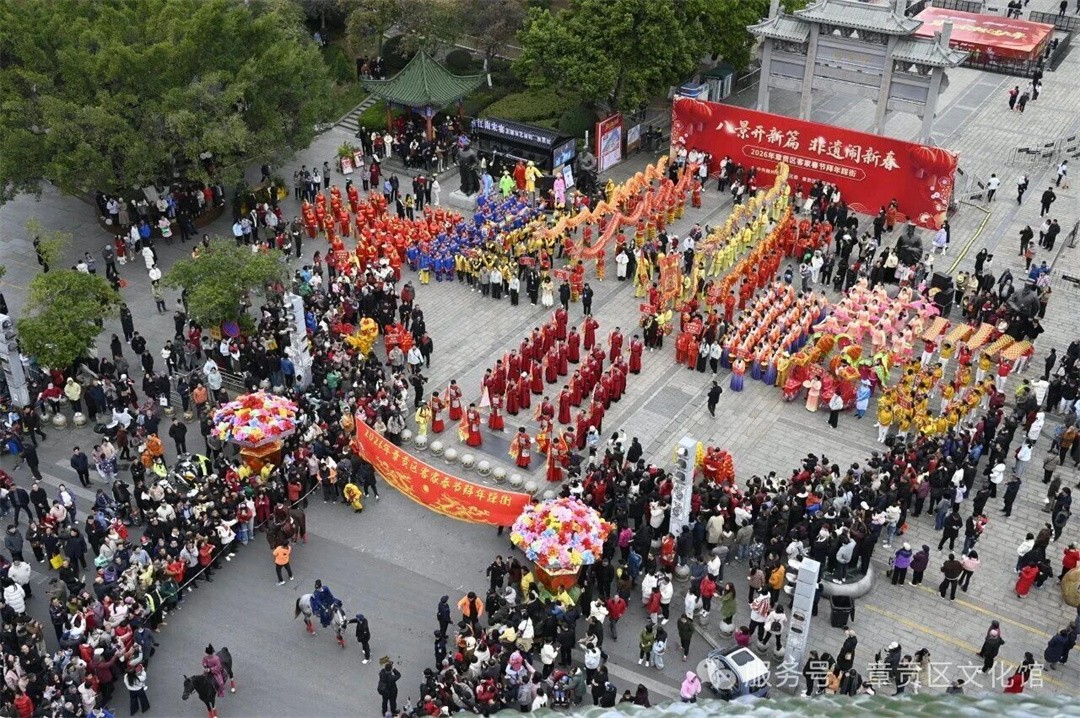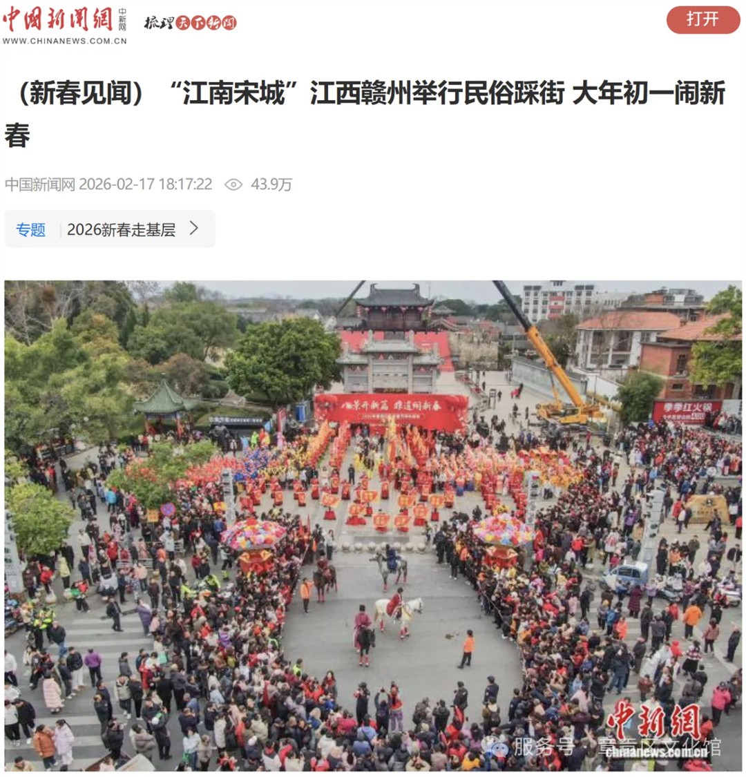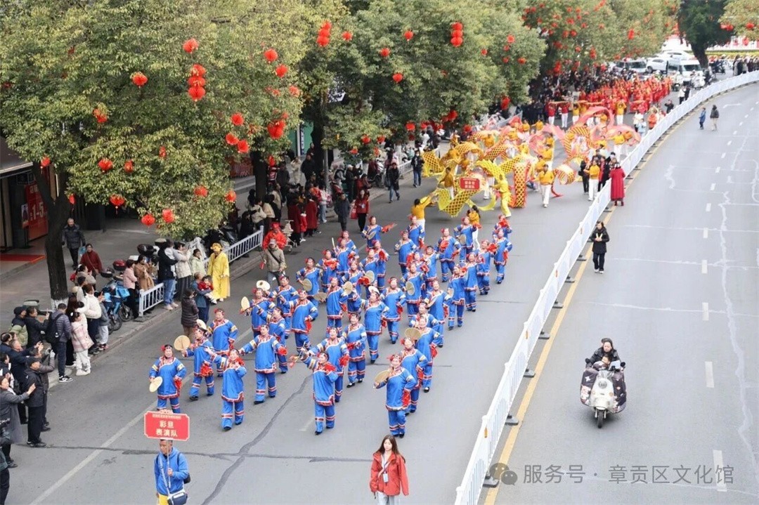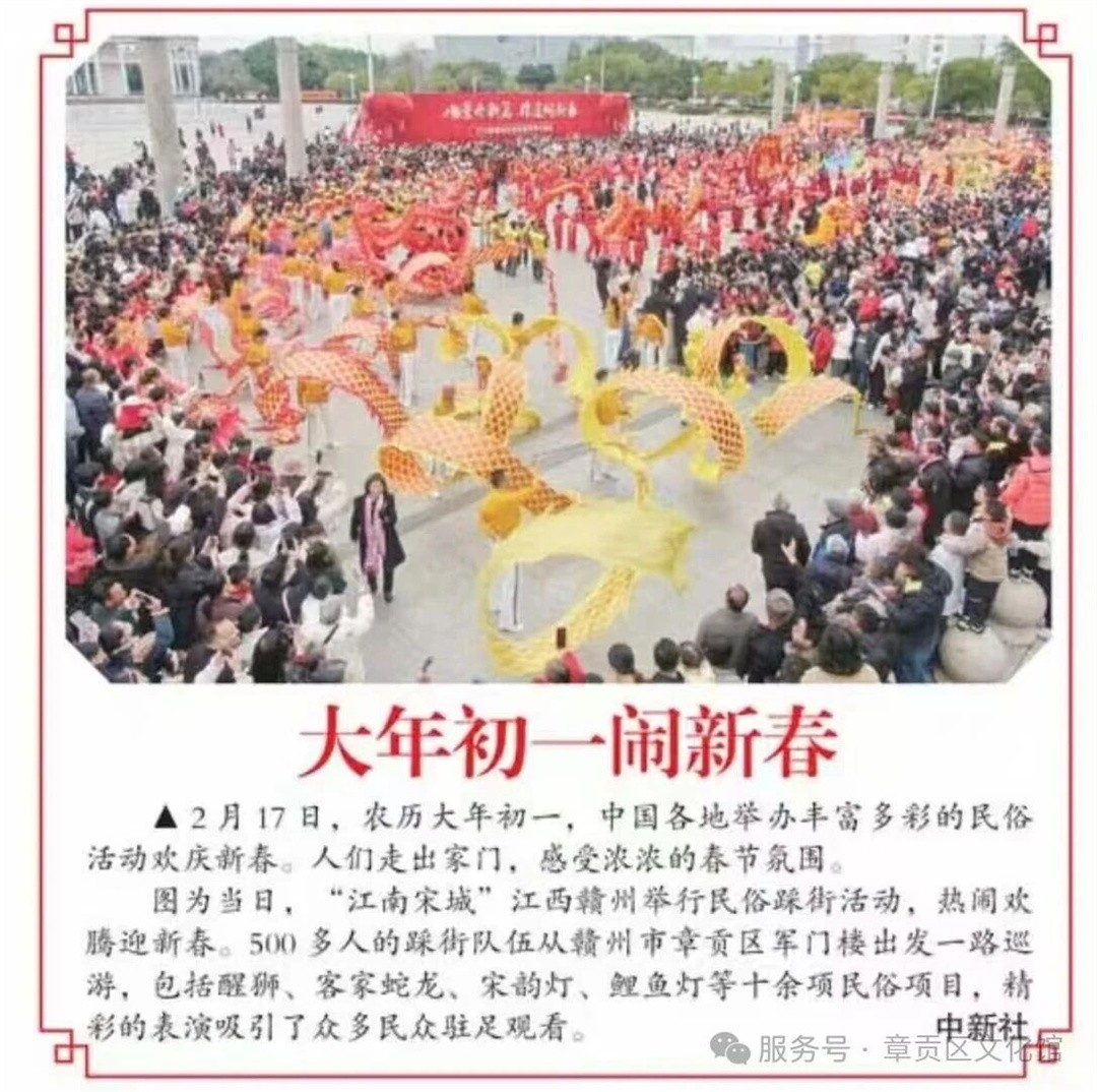 大年初一, “八景开新篇 非遗闹新春”2026年章贡区客家春节拜年踩街活动由14支表演队伍、500余名各界群众组成,气势磅礴的龙灯、威风凛凛的雄狮、原汁原味的非遗项目展演轮番登场,艺人们用最质朴、最热情的表演,将赣南传统文化的独特魅力展现得淋漓尽致。